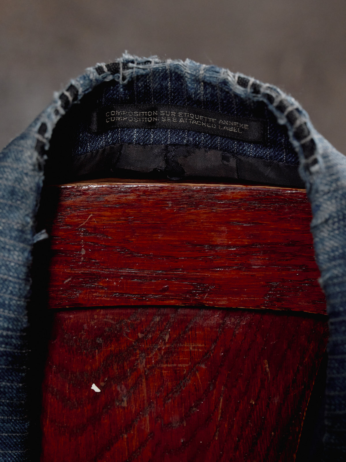 The collar and shoulders are torn.