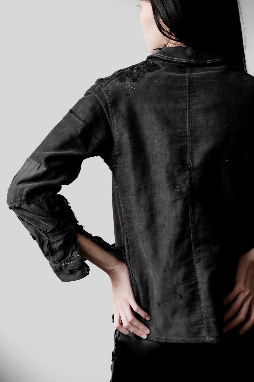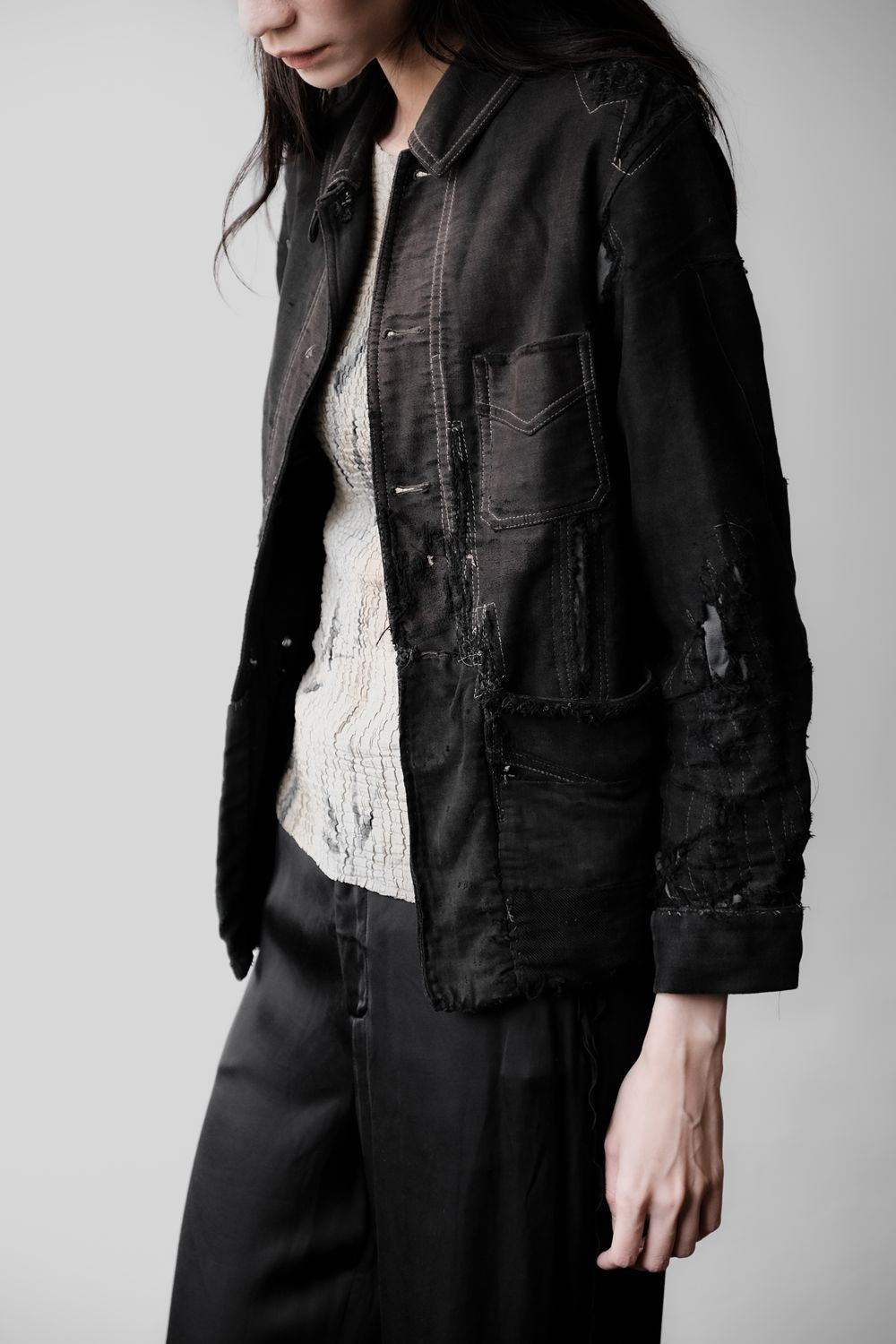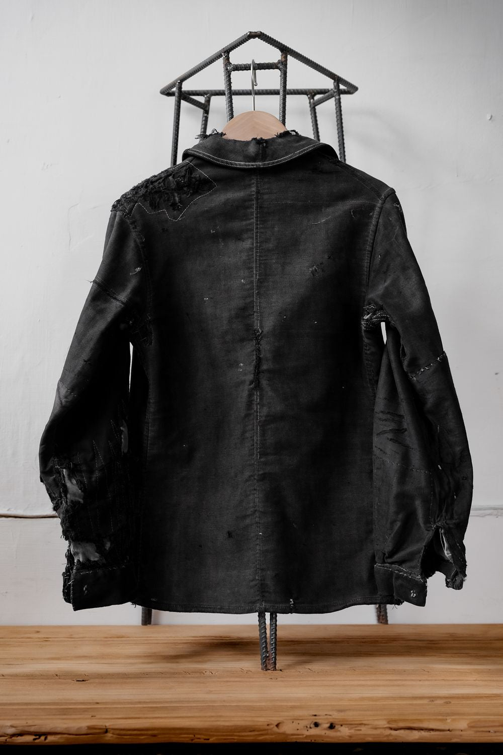 1940年代の「ル・モン・サン・ミシェル」フランス製ヴィンテージ ブラック モールスキン ボロジャケット フランス製ワークウェア ヴィンテージ ブラック モールスキン ボロボロワークジャケット