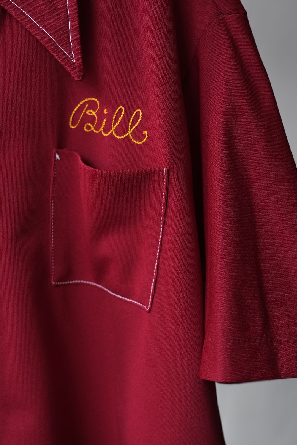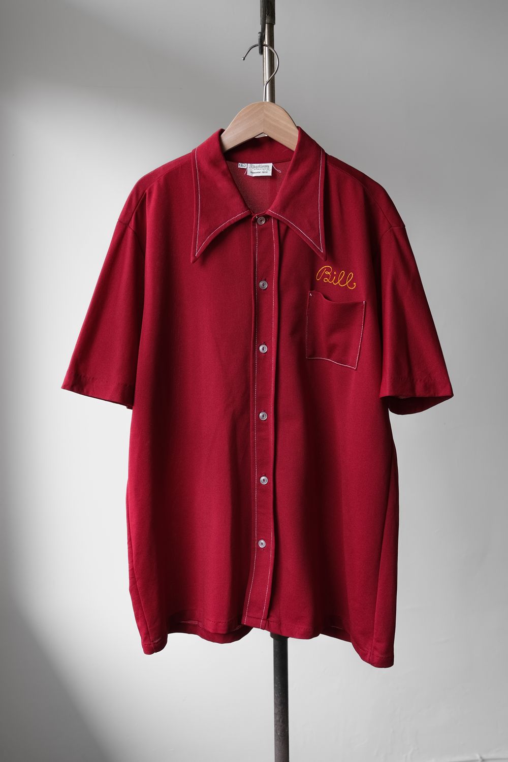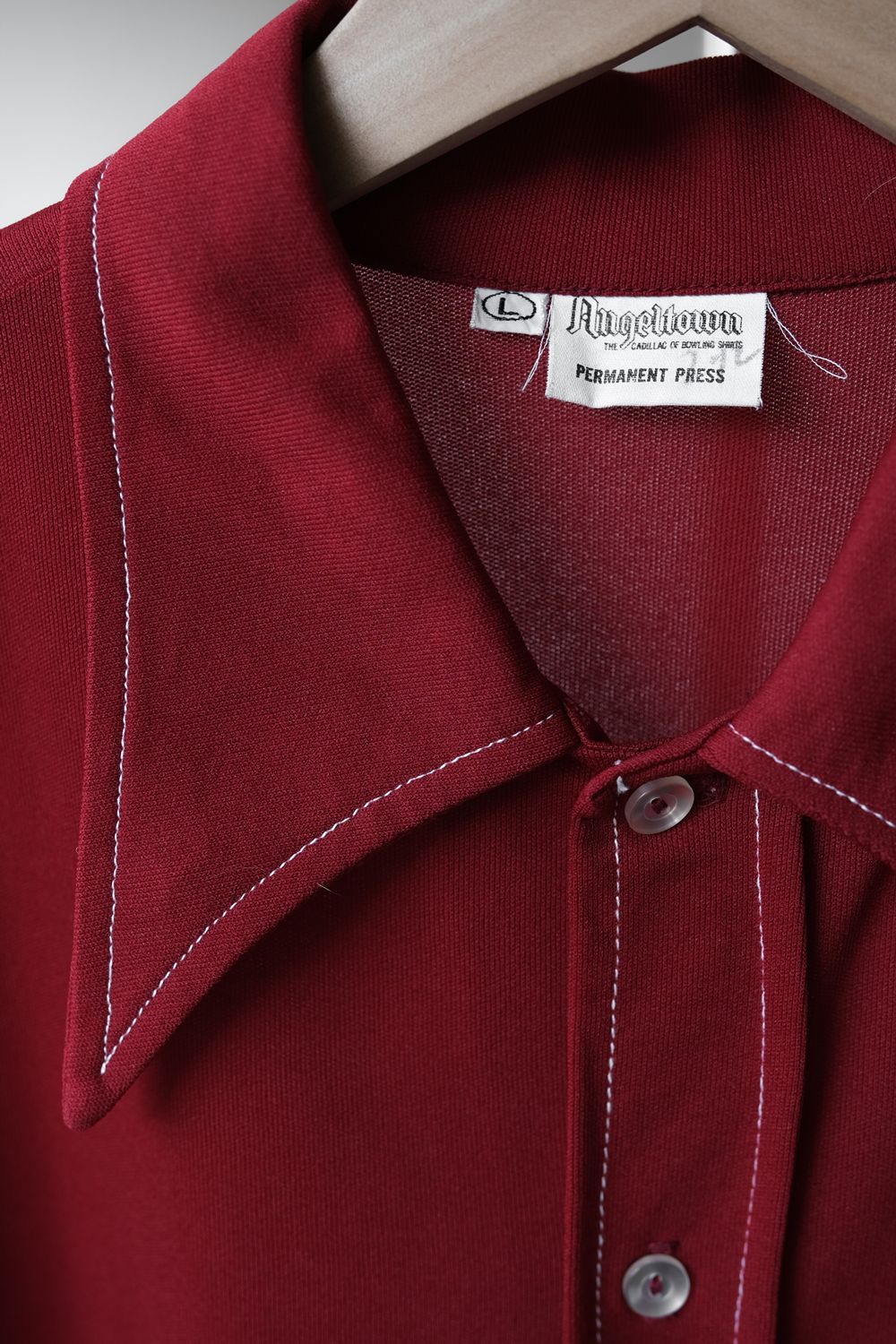 1960年代の「エンジェルタウン」 ポリエステル ボウリングシャツ(チェーンステッチ&フロックプリント) 60年代のヴィンテージボウリングシャツフロントチェーン刺繍 / バックフロックプリント