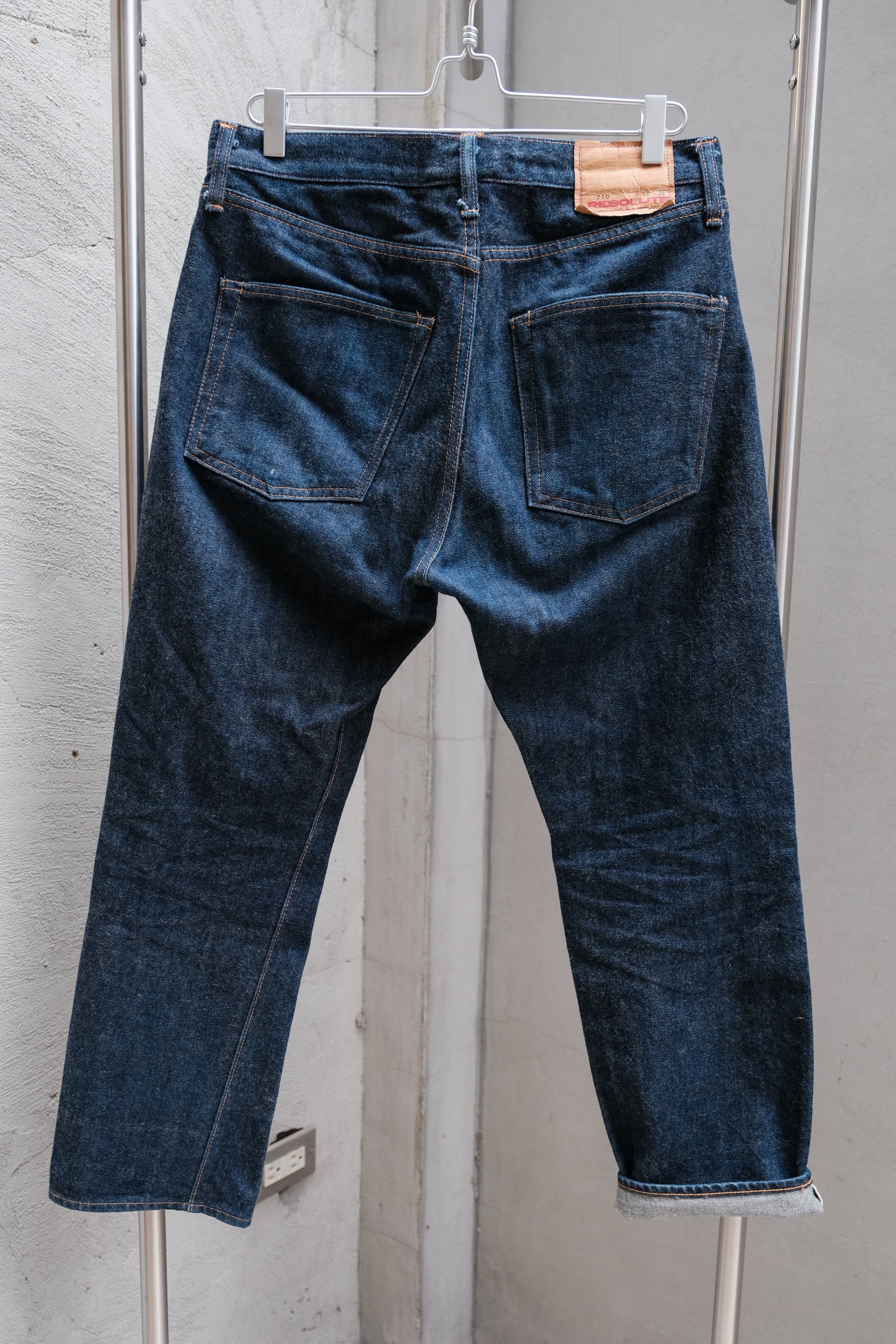 Resolute 定番錐形褲型 710,以 1966 年 Levi's 501 作為設計基礎,布料是由日本岡山 Shinya Co., Ltd. 以舊式力織機織造,重現 1960 年代後期的丹寧布料