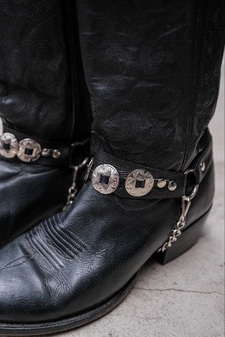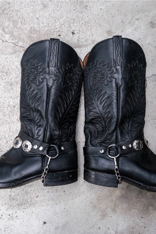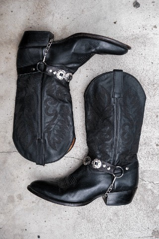 Black Leather Harness Cowboy Boots with Silver Conchos復古黑色皮革銀飾裝飾西部靴 美國製